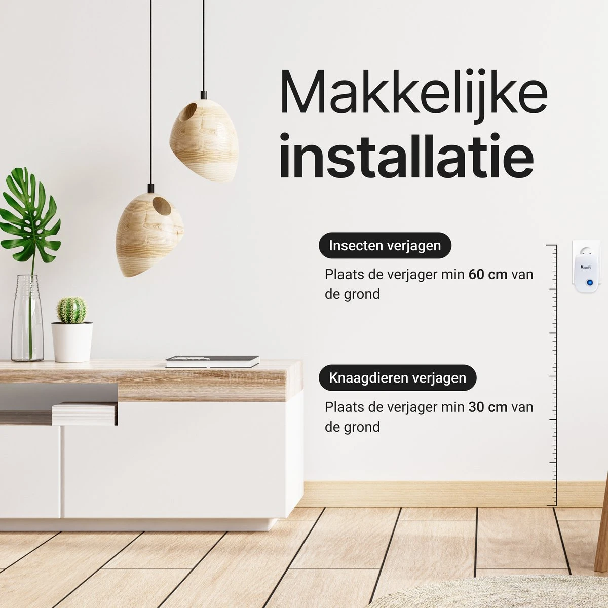 Plaats in ieder kamer één apparaat. Om te beginnen bij de bron van het ongedierte (bijvoorbeeld keuken, kelder of zolder). Wil je muizen en knaagdieren verjagen? Plaats de verjager dan op circa 30 CM hoogte van de grond af. Indien je insecten wilt verjagen, plaats dan het liefst minimaal 60 CM van de grond.