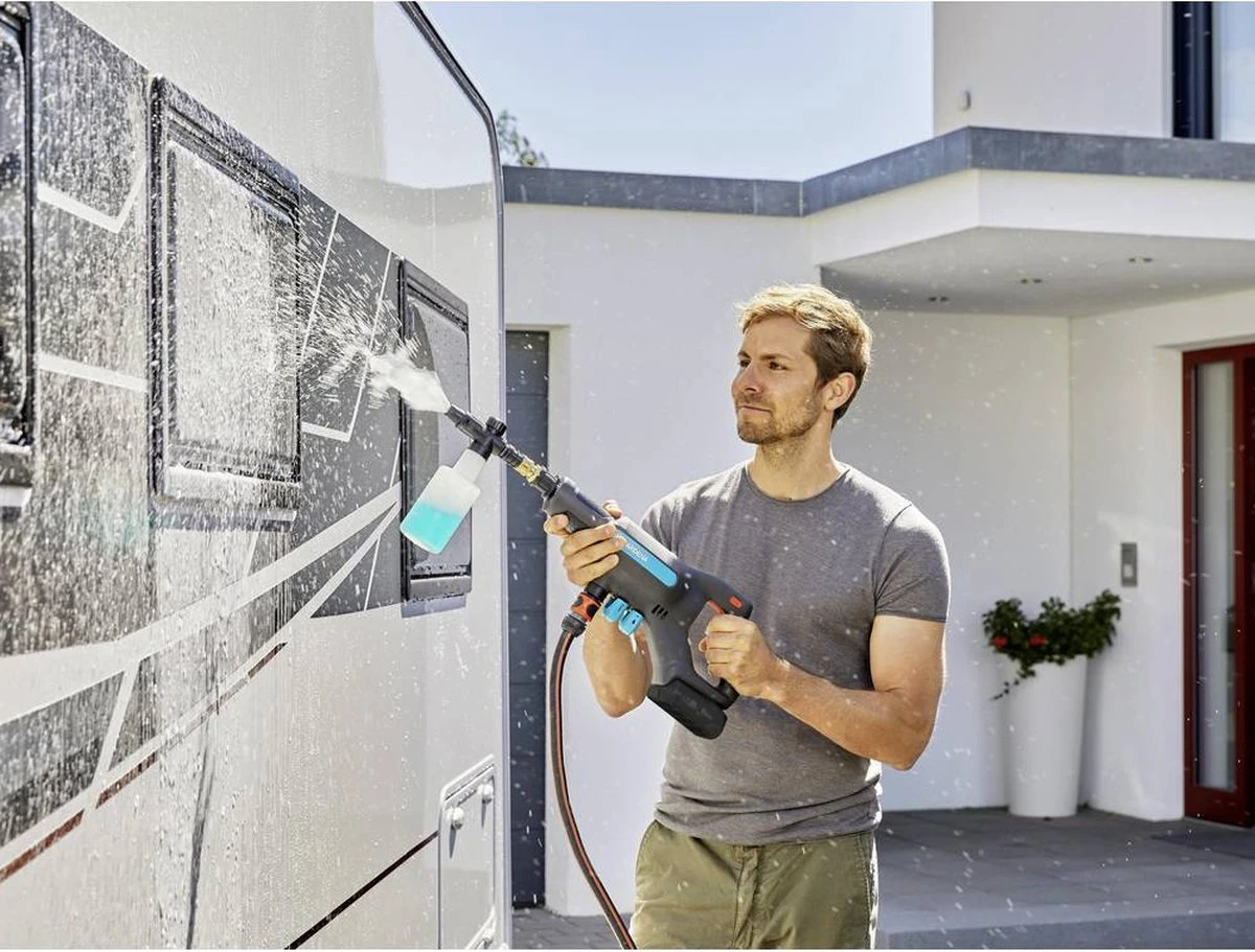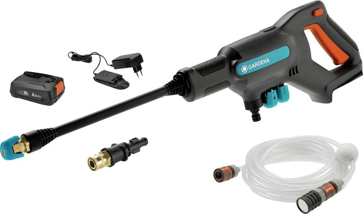 GARDENA presenteert de AquaClean 24/18V P4A kant-en-klare set, speciaal gemaakt voor u en alle andere trotse en gepassioneerde huis- en tuinbezitters. Deze mobiele, compacte en snoerloze medium drukreiniger wordt geleverd met diverse accessoires, zodat je direct aan de slag kunt. Een van de meest veelzijdige drukreinigers in zijn klasse met geïntegreerde LED-accustatus weergave in de machine en 3 vermogensstanden voor 9, 14 en 24 bar druk. Ideaal voor vele schoonmaakklussen. Auto’s, fietsen en vuilnisbakken zijn grondig en krachtig te reinigen met de 24 bar drukinstelling. Indien nodig kan de druk worden verlaagd tot 14 bar of nog verder naar de Soft-Clean-modus. De Soft-Clean-modus van 9 bar is bijzonder zacht, ideaal voor kwetsbare materialen en voorwerpen. Tegelijkertijd verlengt de verminderde druk de looptijd van de oplaadbare accu. De drukreiniger kan ongeveer 38, 20 of 16 minuten werken, afhankelijk van de gebruiksmodus. De nieuwe drukreiniger werkt met een nieuw 18V POWER FOR ALL accusysteem. De POWER FOR ALL ALLIANCE is een van de grootste merk overschrijdende accu allianties van toonaangevende fabrikanten wereldwijd en biedt de grootste verscheidenheid aan toepassingen voor uw huis en tuin. Door de lange accu looptijd kunt u grondige en ononderbroken reinigen. De oplaadbare accu in de kant-en-klare set, is ook geschikt voor andere compatibele apparaten in de POWER FOR ALL ALLIANCE. De accu is snel opgeladen met een capaciteit van 18V en 2,5 Ah. De set bevat drie verschillende spuitmondstukken voor verschillende spuitrichtingen, 0°, 15° of 40°. Elk spuitmondstuk is 360° draaibaar ten opzichte van de lans voor meer flexibiliteit bij het reinigen. De 0° puntsproeier is ideaal voor krachtige reiniging in kleine hoekjes en gaatjes. Afhankelijk van uw vereisten is de AquaClean ook compatibel met de GARDENA vuilfrees. Een 5 m lange aanzuigslang met filter, vlotter en klem is bij de set inbegrepen. Via een OGS kraanaansluiting kan de watertoevoer op de drukreiniger worden aangesloten. Ondanks dat hij niet is aangesloten op het elektriciteitsnet, is de moderne AquaClean zo krachtig dat hij water kan aanzuigen tot een diepte van 2 m dankzij de automatische aanzuigfunctie met een debiet van 250 liter per uur. Of u nu uw auto, fiets, terras, rolluiken of tuinmeubelen wilt schoonmaken – dankzij het intelligente ontwerp, de eenvoudige bediening en het lage gewicht van slechts 1,5 kg zonder accu blijft het werken met de drukreiniger zelfs voor een langere tijd comfortabel. De AquaClean 24/18V P4A kant-en-klare set bevat een korte en een lange sproeilans voor nog meer flexibiliteit en verbeterde ergonomie Met al deze elementen kunt u met deze instelbare drukreiniger uw tuin, fiets, auto of tuinmeubilair met weinig moeite en zonder omslachtige kabels in een handomdraai schoonmaken.