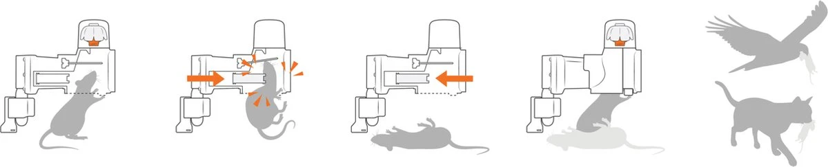 Wanneer ratten of muizen de aantrekkelijke lokstof ontdekt hebben zullen zij zonder aarzelen de val in kruipen. De trigger-pen in de val wordt door het knaagdier geactiveerd waardoor een slagpen binnen een fractie van een seconde de rat of muis dood. Geen langdurige kwelling, maar een zeer snelle dood.
