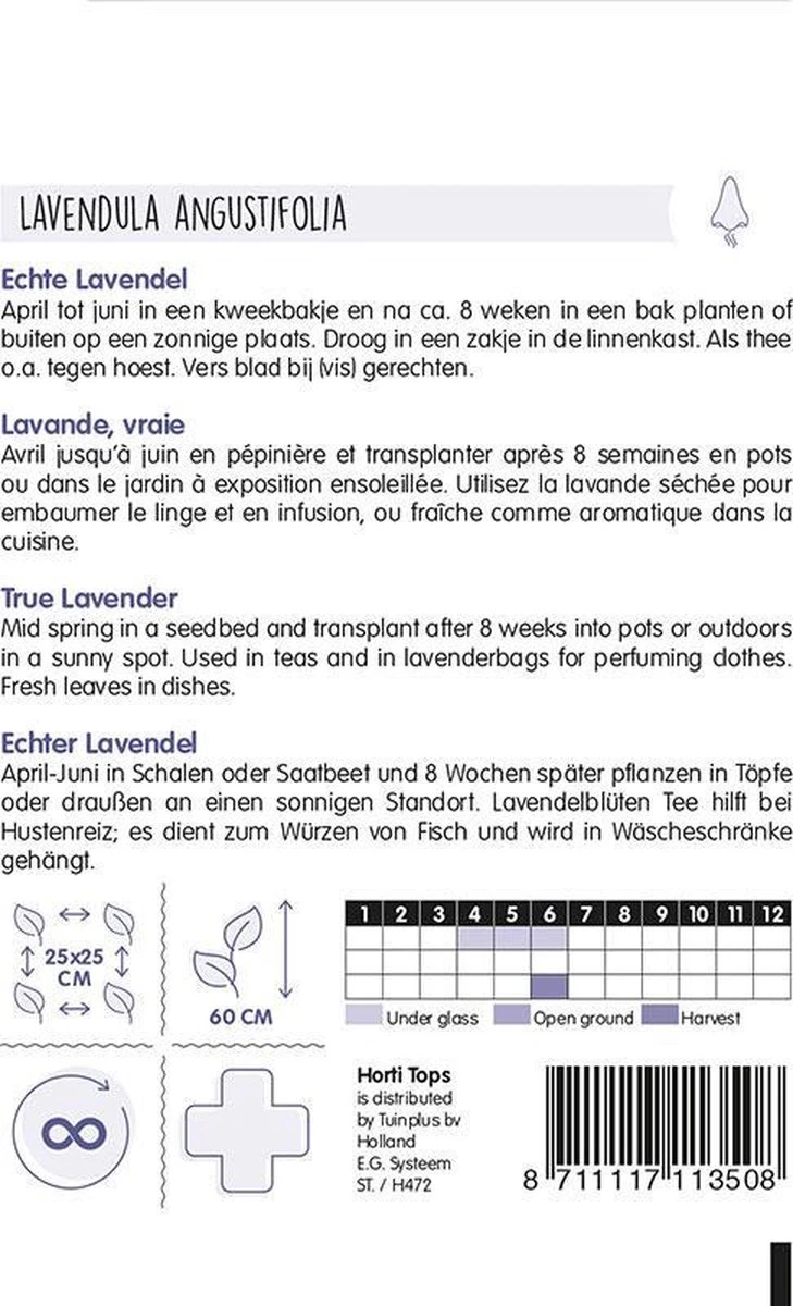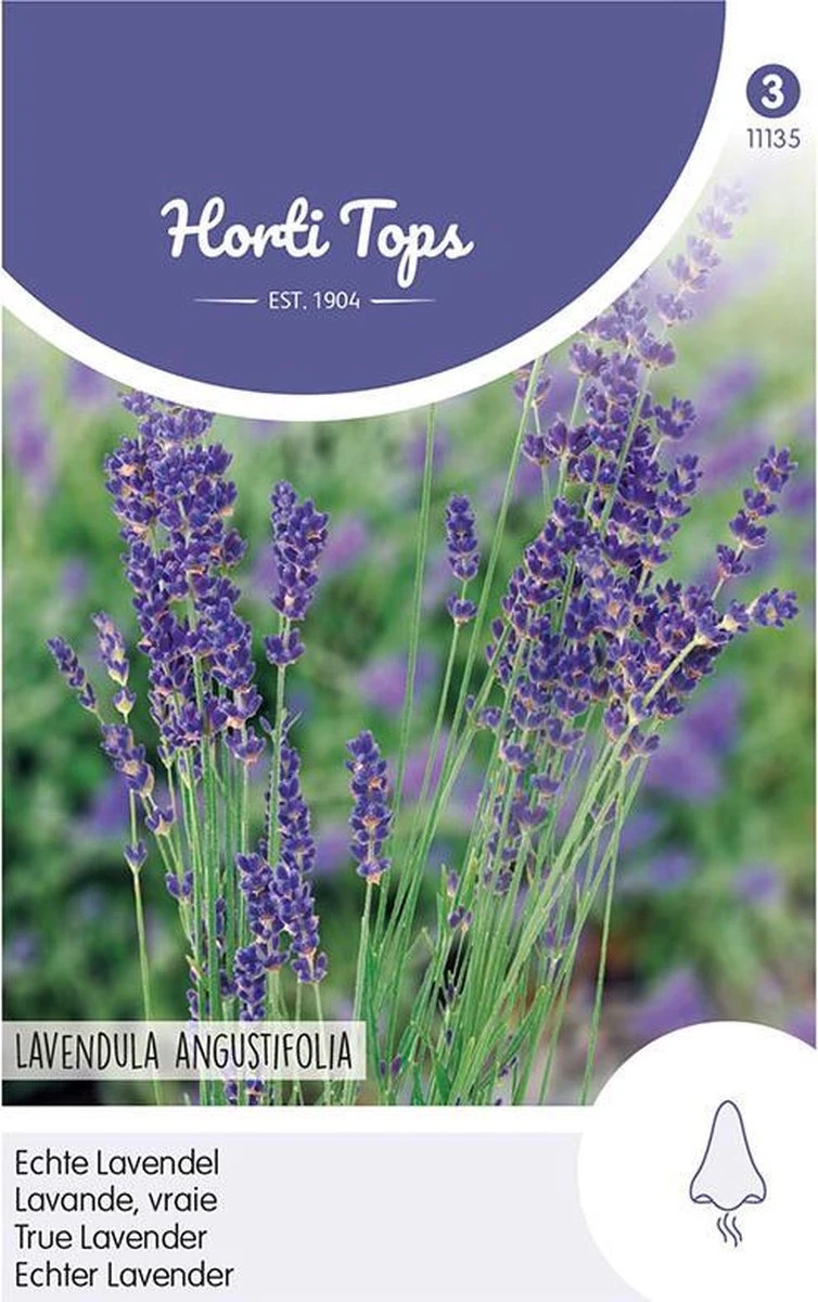 Echte Lavendel. Vanaf april tot juni zaaien in een kweekbakje en na ca. 8 weken in een kweekbak planten of buiten op een zonnige plaats. Droog in een zakje in de linnenkast. Als thee o.a. tegen hoest. Vers blad bij (vis) gerechten.