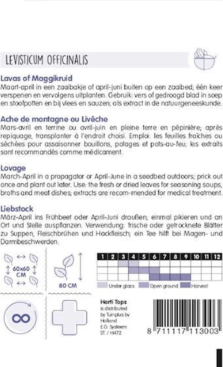 Lavas. Vanaf maart t/m april zaaien in een kweekbakje of van april tot juni buiten op een zaaibed; één keer verspenen en vervolgens uitplanten. Ook wel maggikruid genoemd. Gebruik: vers of gedroogd blad in soep en stoofpotten en bij vlees en sauzen; als extract in de natuurgeneeskunde.
