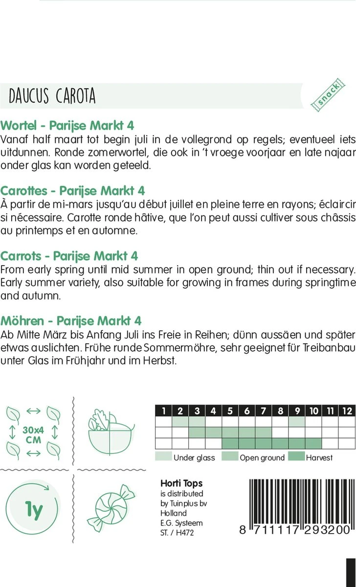 Wortel – Parijse Markt 4 (Ca. 5 gram zaden). Vanaf half maart tot begin juli zaaien in de volle grond op regels; eventueel iets uitdunnen.