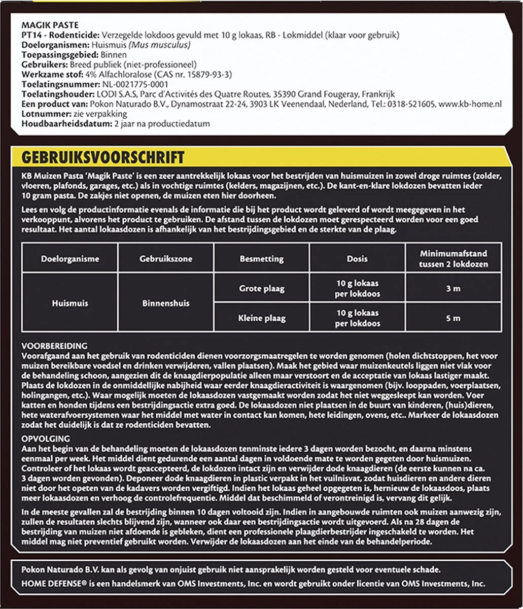 Plaats het product bij voorkeur in de buurt van waar muizenactiviteit is waargenomen. Let wel op dat bij gebruik van rodenticiden voorzorgsmaatregelen getroffen dienen te worden, waaronder het dichtstoppen van gaten en eten en drinken waar muizen aan kunnen zit weghalen.