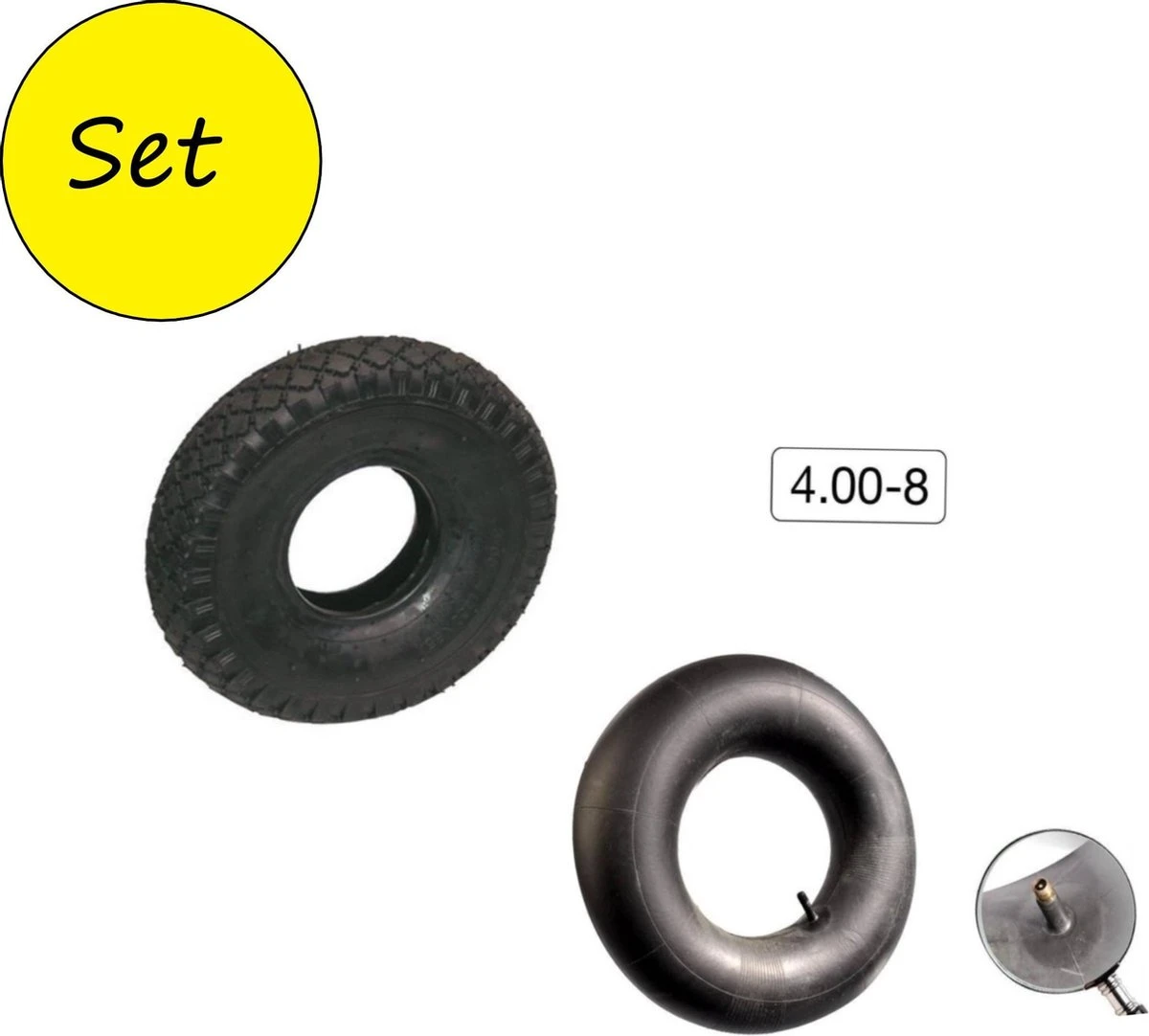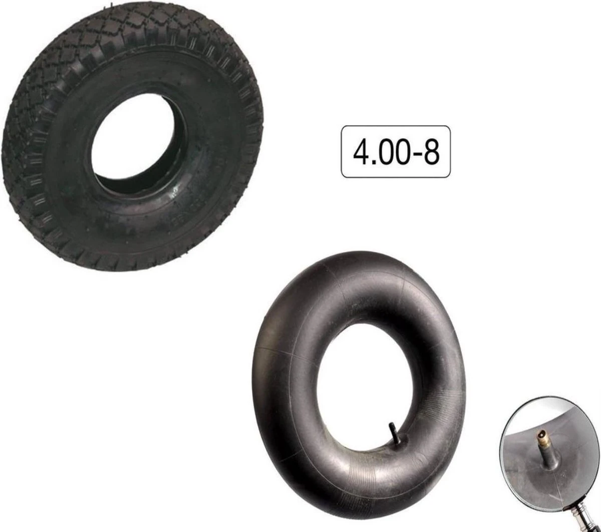 Sterke nieuwe binnen en buitenband voor een standaard kruiwagen maat. Maat 4.80/4.00-8 recht ventiel.