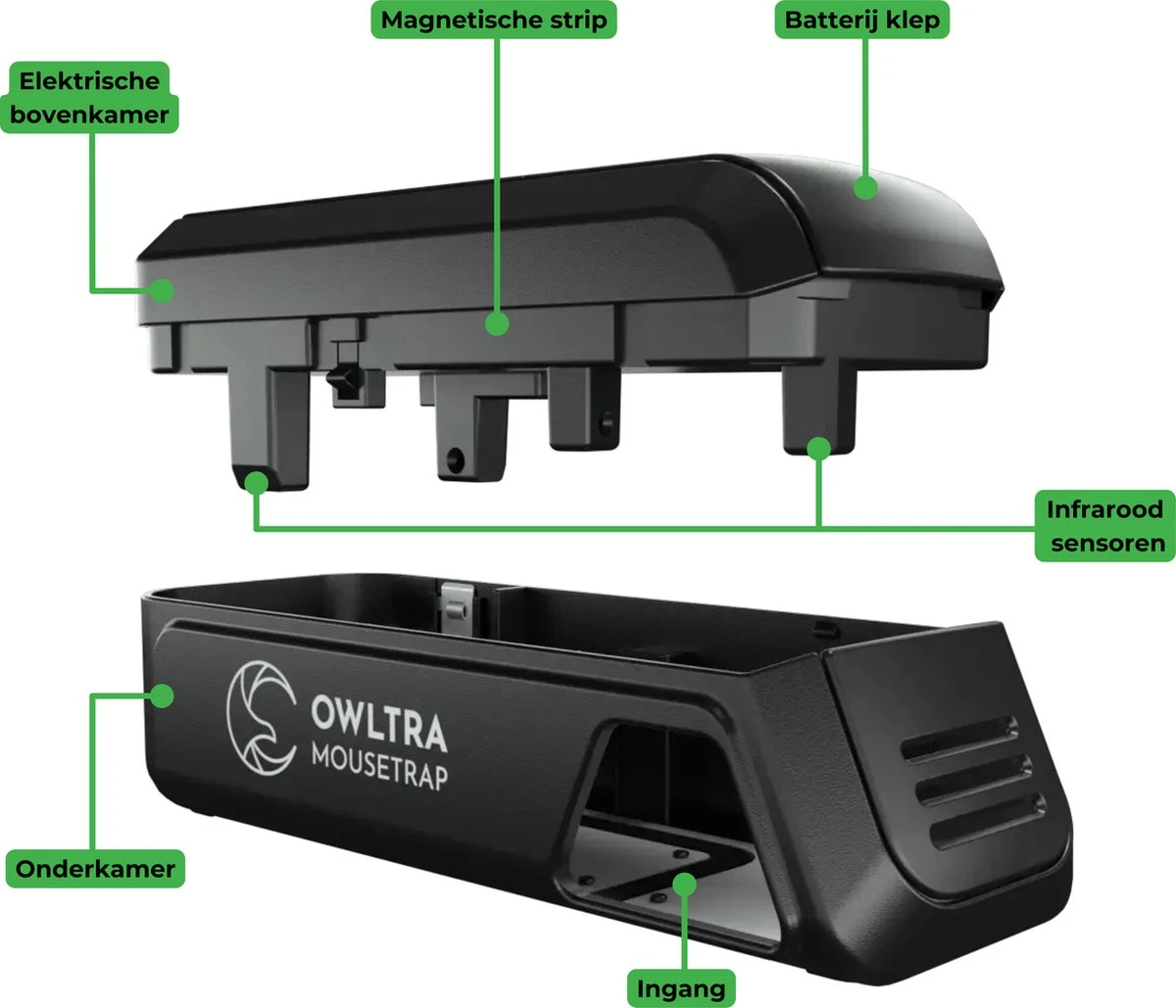 De kamer van de muizenval is ontworpen met twee infraroodsensoren, één bij de ingang en één aan de achterkant. OWLTRA wordt alleen geactiveerd wanneer het een muis in de val detecteert, waardoor valse zaps worden voorkomen en kinderen en kleine huisdieren worden beschermd.