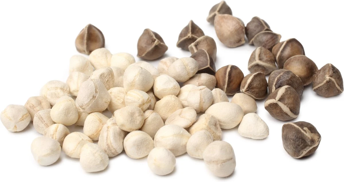 Pel de schil van het zaadje af en eet het witte balletje dat overblijft.