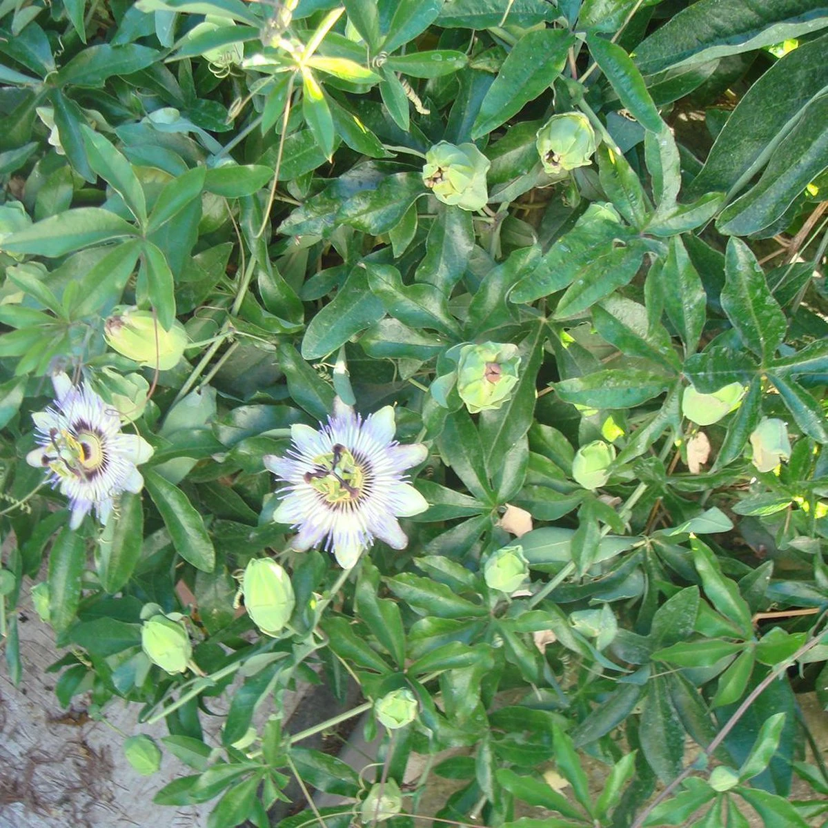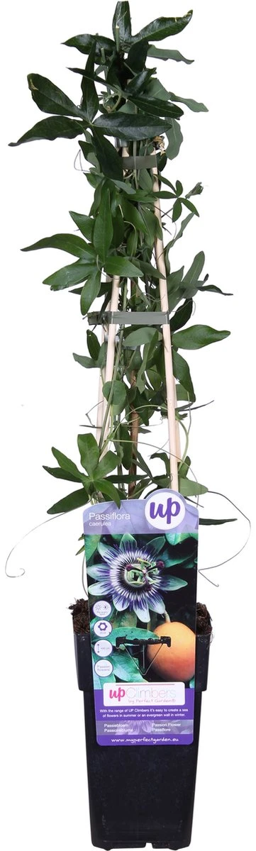 Passiflora caerulea of blauwe passiebloem is een wintergroene klimplant, met een smal opgaande vorm en brede, handvormige, glanzende, donkergroene bladeren.