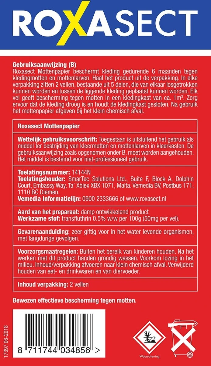 Ben jij helemaal klaar met al die motten in je kledingkasten en die gaatjes in jouw mooie kleding en dekens? Roxasect mottenpapier houdt jouw kledingkast zes maanden mottenvrij. Het papier bestrijdt motten en mottenlarven effectief. De voordelen van Roxasect Mottenpapier: – Bestrijdt motten effectief – Voor liggende kleding – Werking: 6 maanden