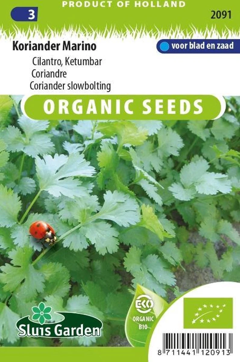 Marino is verbetering van de standaard Koriander. Duidelijk beter bestand tegen het in bloei schieten. Mooi dicht blad, dunne stengels en een zeer gezond gewas. Ook bekend als Cilantro, Coriandolo, Dhania, Ketumbar, want Koriander levert ons twee smaken. Het blad (Cilantro) heeft een zeer eigen, frisse peterselieachtige geur en is als kruid onmisbaar in Mexicaanse en Aziatische salades, soepen en vleesgerechten, terwijl het zaad (Coriander) een specerij is met een plezierige aroma en wordt veel gebruikt in Europese en Midden-Oosterse keuken.