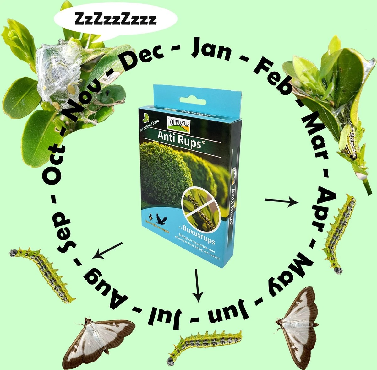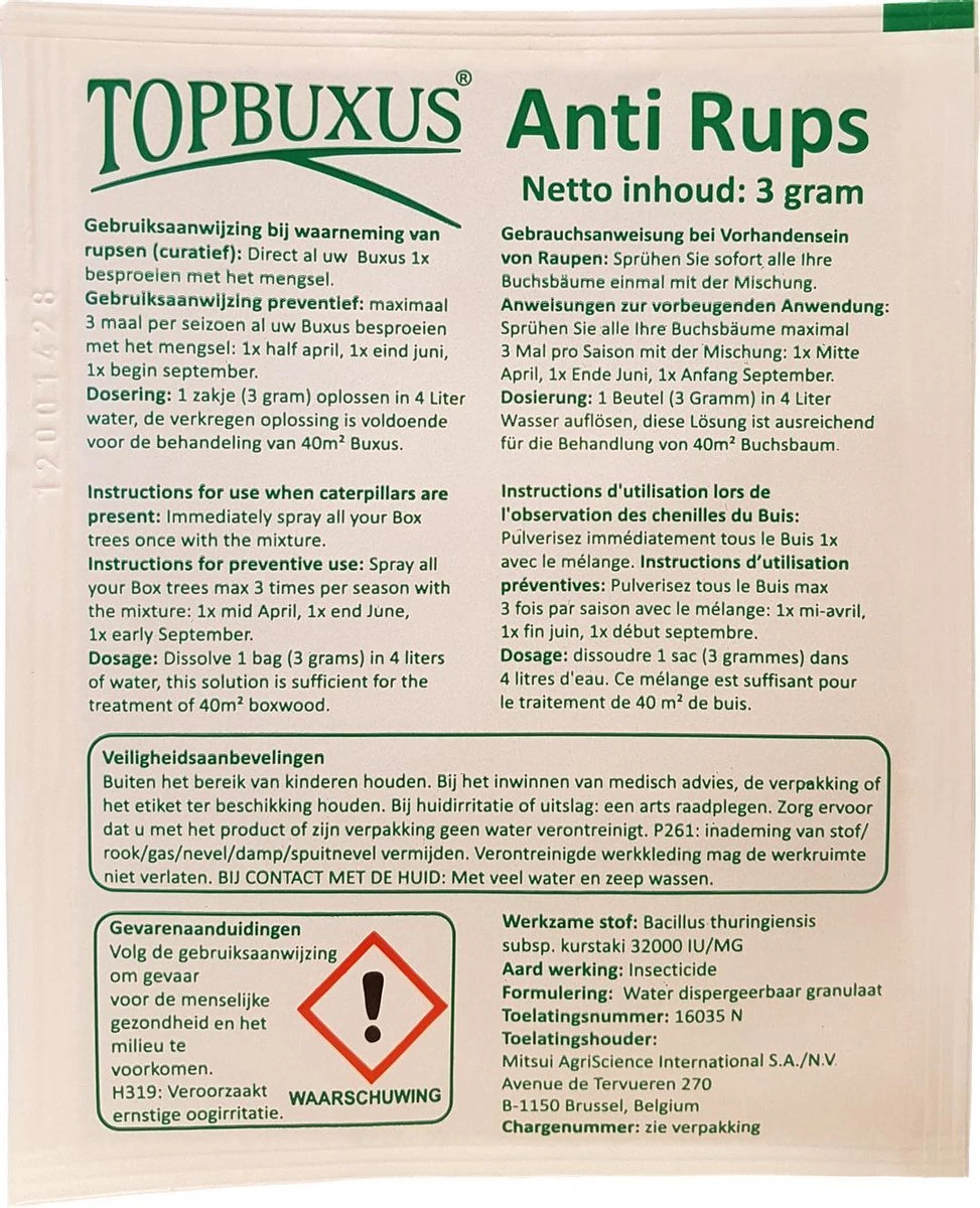 - TOPBUXUS Anti Rups® is 100% veilig voor mensen en andere dieren, zoals bijen en (jonge) vogels die de behandelde rupsen opeten.