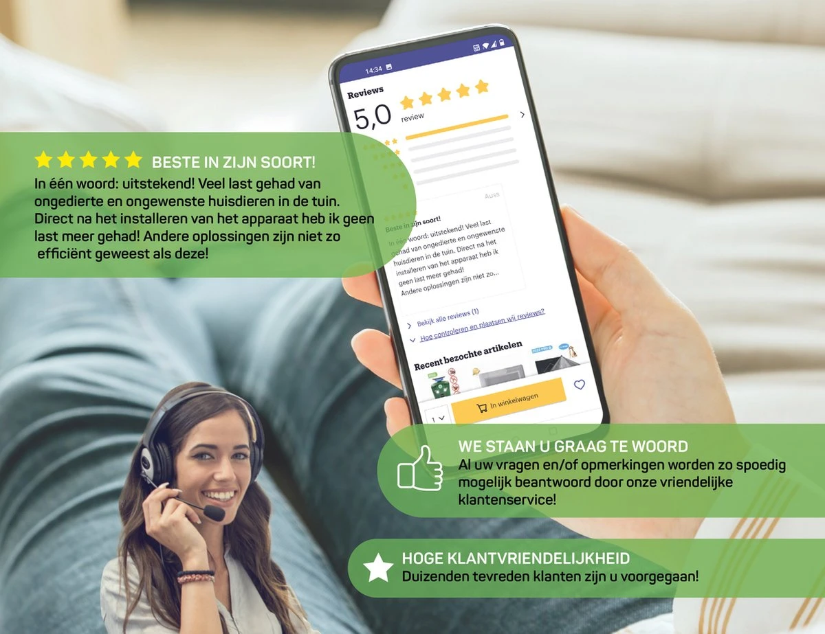 Ben je niet tevreden over onze Ultrasone verjager? Dat vinden wij uiteraard erg vervelend om te horen, maar wij willen je graag tevreden houden en dus kun je de verjager tot 30 dagen na je aankoop, kosteloos aan ons retour sturen.